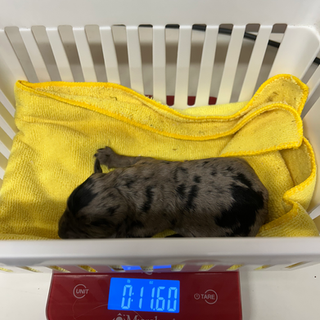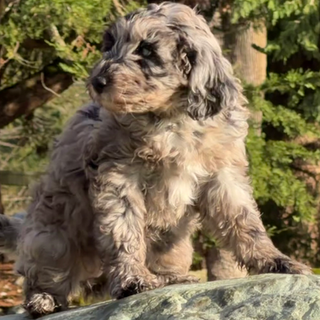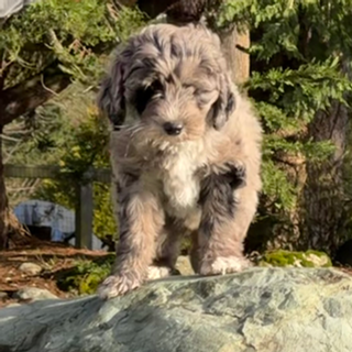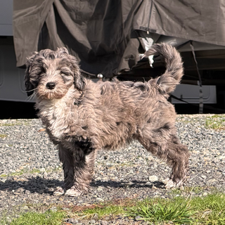 Royal or "Roy" is a large miniature parti factored blue merle phantom poodle. Roy is AKC registered & carries for brown & red. Royal is 17" tall and weighs 25 lbs.